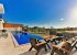 Our villa has a capacity of six people, including two bedrooms, and has two bathrooms. The first bedroom has a double bed, jacuzzi, air conditioning, en-suite bathroom and TV. The second bedroom has two single beds, a jacuzzi, air conditioning and a bathroom. There is a kitchen, air conditioning, TV, sitting group and WC in the living room. In addition, there is a third room in our villa with a hammam and sauna. There are two single foldable beds and air conditioning.