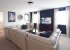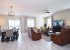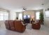 Step into the open-plan living space complete with lounge area featuring two recliner sofas, armchairs, a large Smart TV, a ceiling fan, sliding doors out to the pool deck and views to the pool.