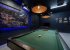 AIR CONDITIONED games room has a pool table and air hockey, flat screen TV with a PS4 video game console, comfortable leather sofa.