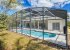 The property has open lawns with a white privacy fence at the rear of the property, with enclosed pool deck and lanai.